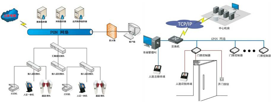 一卡通系统网络基于校园全光纤网络基础上,消费机、门禁控制器、会议签到器等采用TCP/IP通讯方式,通过光网络终端(ONT)接入网络,在交换机及OLT设备上为一卡通系统采用划分VLAN方式进行建设,一卡通系统的各设备通过骨干光网络和中心服务器联结进行数据交换。